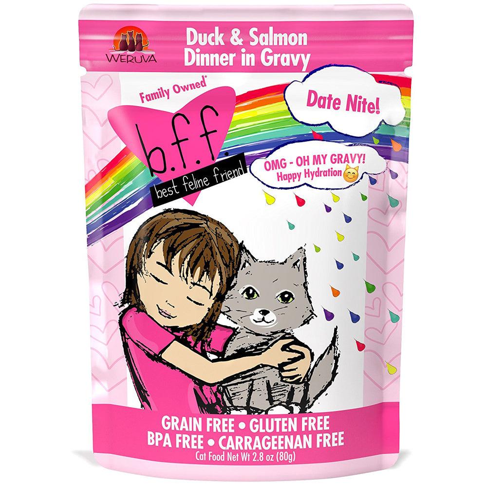 Weruva's b.f.f. OMG Date Nite! Duck & Salmon Dinner in Gravy is a gourmet meal with tasty bits of duck and salmon in a flavorful gravy. No need to save this recipe for a special occasion, make every night a date night! Only the best for your best friend!