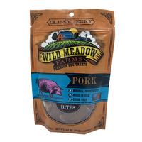 New from Wild Meadow these Classic Pork Bites are perfect as a high reward treat! Savory, aromatic and chewy jerky is a delicious everyday treat, or break into smaller pieces for training or for use in treat dispensing toys. Grain free, limited ingredients, and made in the U.S.A. Your dog is going to love these! 3.5 oz bag.