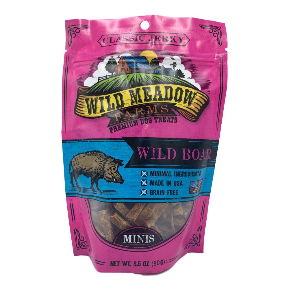 New from Wild Meadow these Classic Wild Boar Minis are the perfect high reward treat for smaller dogs! Savory, aromatic and chewy jerky is a delicious everyday treat. Smaller pieces are great for training or for use in treat dispensing toys. Grain free, limited ingredients, and made in the U.S.A. Your dog is going to love these! Net wt. 3.5 oz.