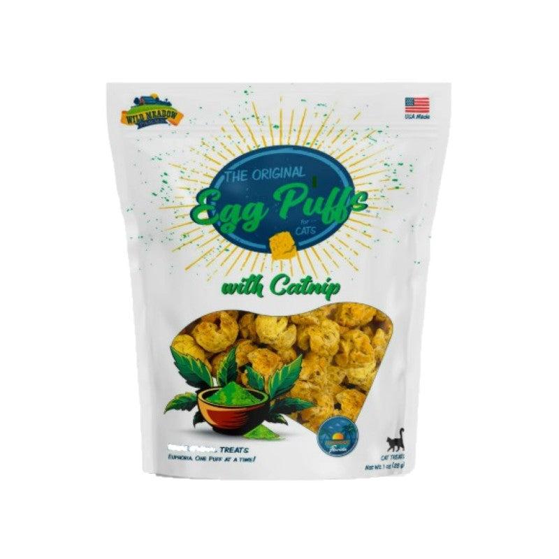 Wild Meadow Farms Egg Puffs for Cats with Catnip are an airy textured treat that help support a healthy diet. Net wt. 1 oz. Made in the USA.