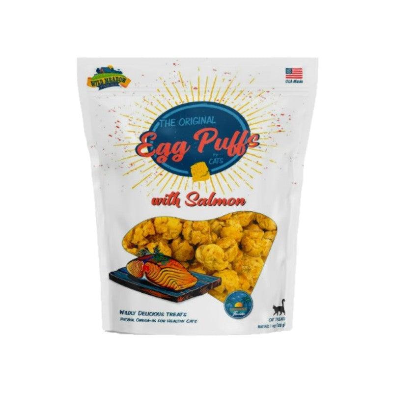 Wild Meadow Farms Egg Puffs for Cats with Salmon are an airy textured treat that help support a healthy diet. Net wt. 1 oz. Made in the USA.