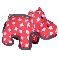 Hanna Hippo is a cheerful toy with her bright red coat and sweet expression. She's also a pretty tough gal! Made with a durable fabric outer layer with a strong mesh fused lining and stuffed with safe, non-toxic fiber fill, toy includes multiple squeakers to provide loads of stimulating entertainment. Indoors or outdoors, this colorful toy is easy to grab and fun to carry, perfect for fetch, catch and tug!