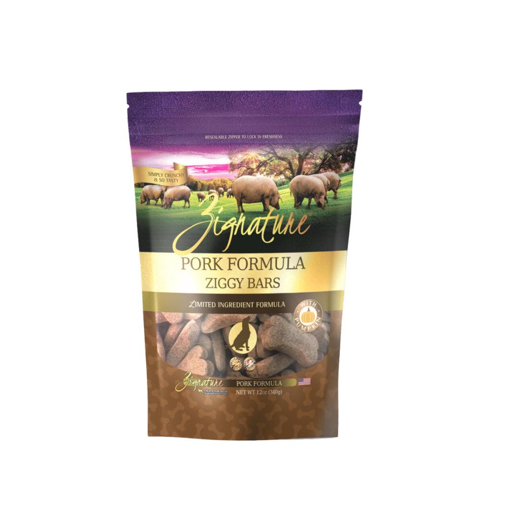 Pork Zignature Ziggy bars are a high quality delicious treat formulated with the same limited ingredients as Zignature dry and canned foods. Ziggy bars are a simple yet tasty treat with meat as the first ingredient followed by other wholesome ingredients.