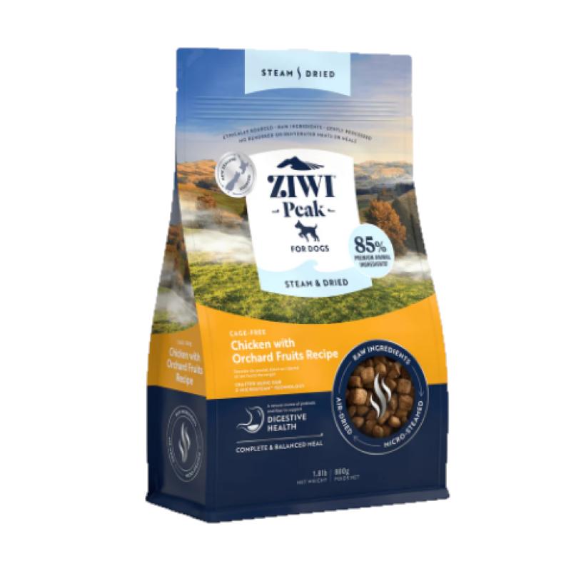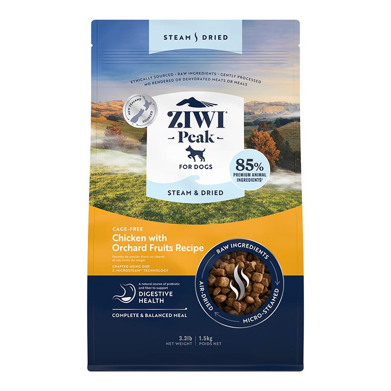 Transport your pup to the fresh flavors of the rolling green pastures of New Zealand with Ziwi Peak's two-step Z-MicroSteam™ technology Chicken with Orchard Fruits Recipe! Expertly crafted with 85% premium raw meats & organs and loaded with flavorful and nutrient rich fruit for a totally balanced diet; from puppy to senior dog. Your pet will love that each bite is packed with tasty apples, pears, kiwifruit, blueberries and persimmons, and pet parents will love the added chicory root to support digestion. Step up your dog's diet with this incredible balanced diet!