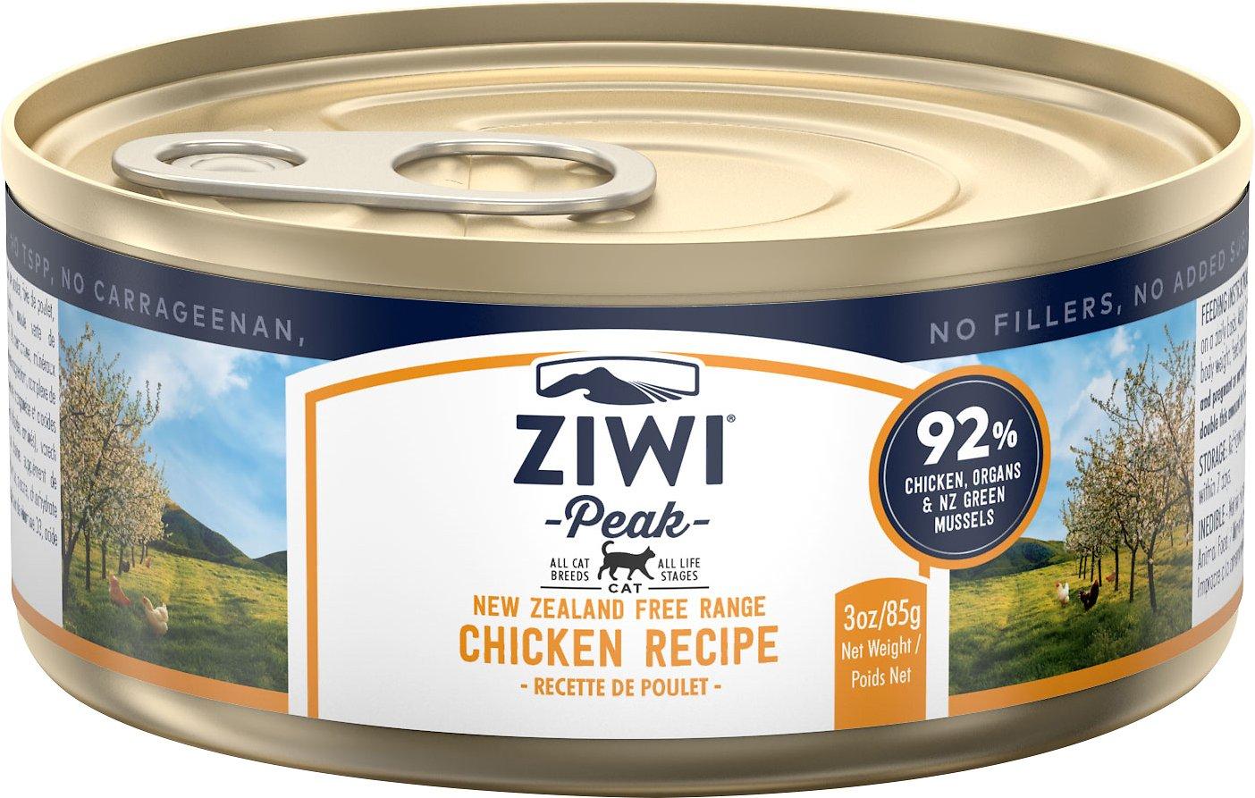 Peak nutrition without compromise! Ziwi Peak Chicken for cats is a simple recipe full of flavor and optimal nutrition. New Zealand free range chicken with chicken organs and green mussel from the pristine blue oceans of New Zealand provide a decedent diet your cat will crave. Ziwi Peak Chicken for cats is grain-free hormone free, preservative free and doesn't contain fillers, antibiotics or carrageenan. Add some whole-prey moisture rich protein to your cat's diet with Ziwi Peak's chicken recipe. Available in 3 oz can.